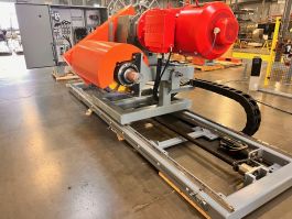 The winch assembly travels horizontally on linear ways mounted to a structural frame/skid. A cable chain system manages power and control routing during movement, ensuring safe and reliable operation across the full travel range.